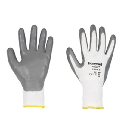 Сив водоустойчив нитрил на дланта и пръстите върху бял полиамид.